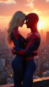 Romantic moment of Spiderman embracing his love under sunset, symbolizing power and passion.