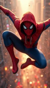 Spiderman leaping mid-air through city lights, capturing iconic superhero action and fearless spirit.