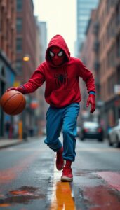 Spiderman dribbling basketball in urban streets, blending superhero energy with playful street vibes.