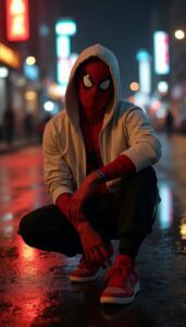 Spiderman crouching in night city lights, glowing neon vibes with heroic mystery.