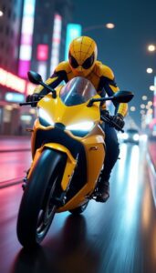Yellow Spiderman rides superbike at night, neon city lights glowing fast and furious.
