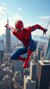 Classic Spiderman swings high above city skyline, fearless hero soaring through skyscrapers.