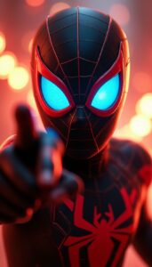Miles Morales with glowing blue eyes, intense focus and futuristic superhero vibes.