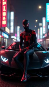 Miles Morales sits stylishly on black supercar, neon city lights enhancing heroic aura.