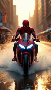Spiderman rides red superbike splashing water at sunset, ultimate action and power moment.