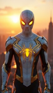 Golden armored Spiderman stands strong at sunset, glowing chest emblem shining heroic light.