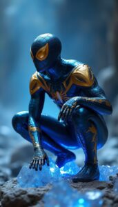 Blue armored Spiderman crouches on glowing crystals, mysterious power radiating cosmic energy.