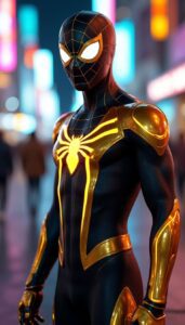 Black and gold Spiderman glowing suit under neon lights, futuristic superhero style unmatched.