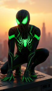 Green neon Spiderman crouches on rooftop at sunset, glowing suit radiates futuristic power.