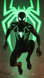 Spiderman in glowing green suit leaps forward with strength, neon spider emblem shining bright.