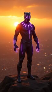 Black Panther stands tall at sunset, glowing purple suit shining with heroic energy.