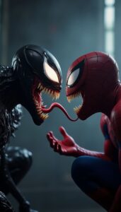 Spiderman and Venom face-off closely, sharp teeth and tongues clash in intense confrontation.