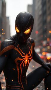 Spiderman in black-orange glowing suit crouches in burning city streets, radiating unstoppable fiery power.