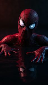 Spiderman rises from dark water with glowing eyes, reflection creating a haunting heroic aura.
